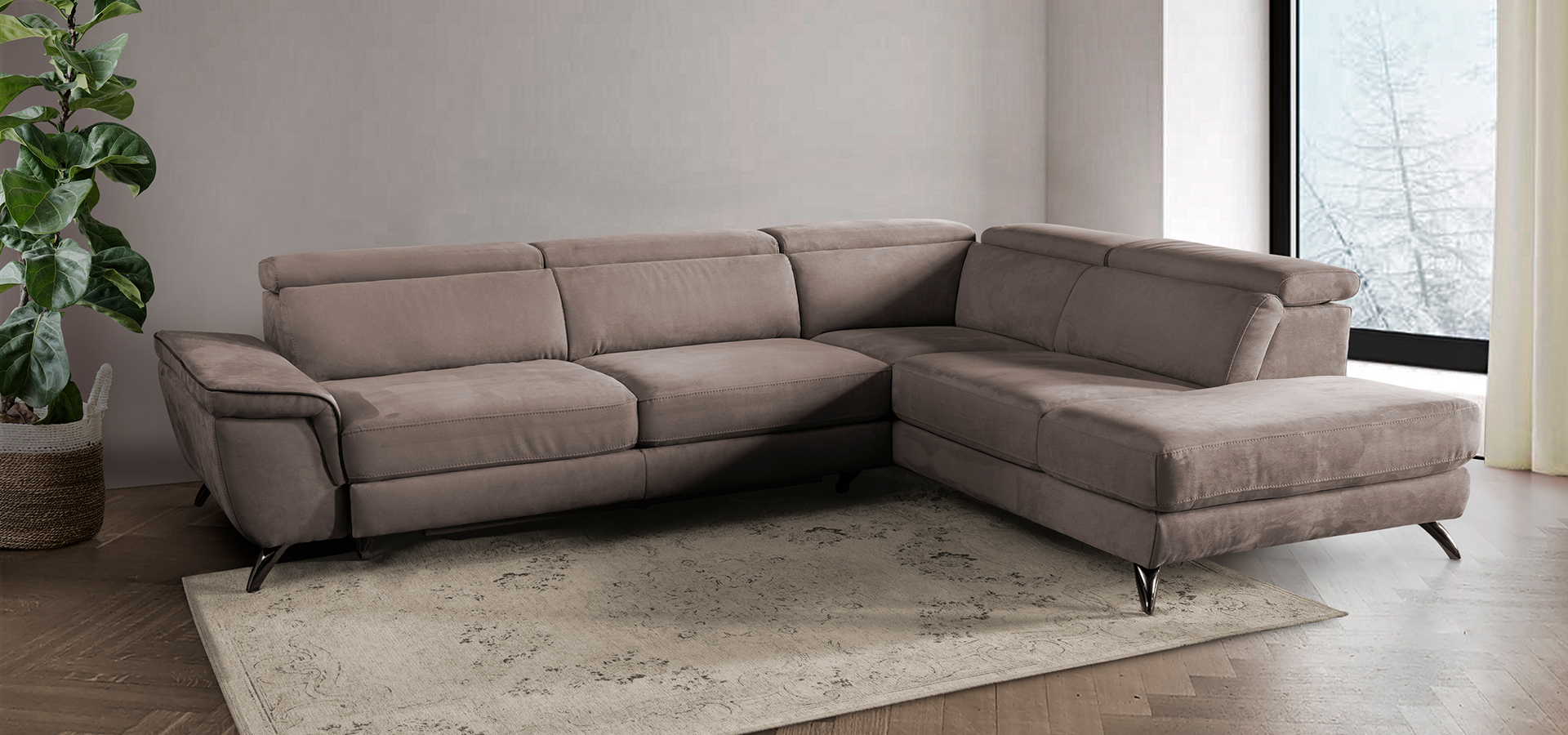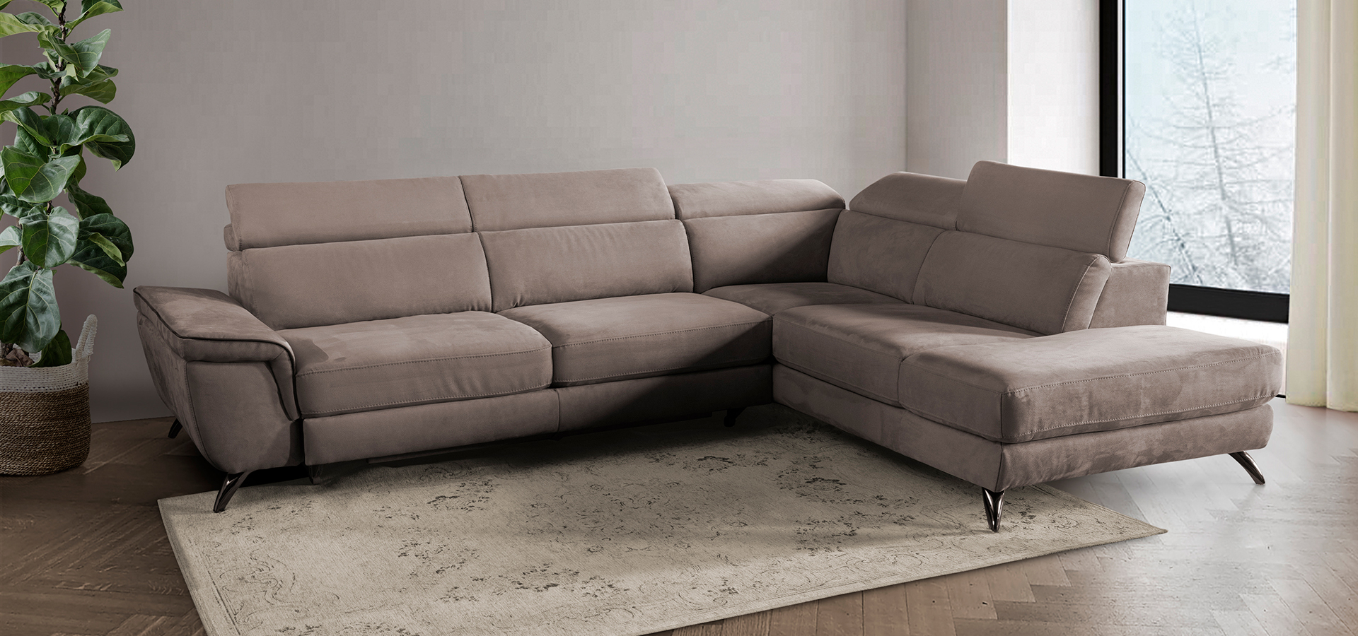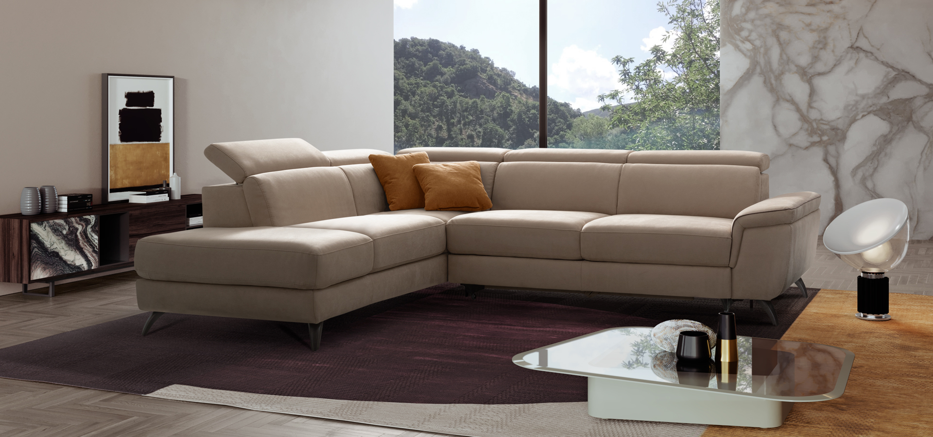 Un divano dalle linee sobrie ed eleganti, sedute ampie e un’imbottitura sostenuta, il suo design classico si adatta bene ad ambienti raffinati e ricercati. Dispone di una pediera estraibile che al bisogno può diventare un letto di emergenza. Essendo un prodotto artigianale made in Italy può essere realizzato nella versione con chaise longue oppure con penisola, ma anche in altre misure secondo la richiesta, ed è possibile personalizzarlo anche nel rivestimento e nel colore. I piedini sono alti in metallo e i poggiatesta sono tutti regolabili, per il massimo comfort.